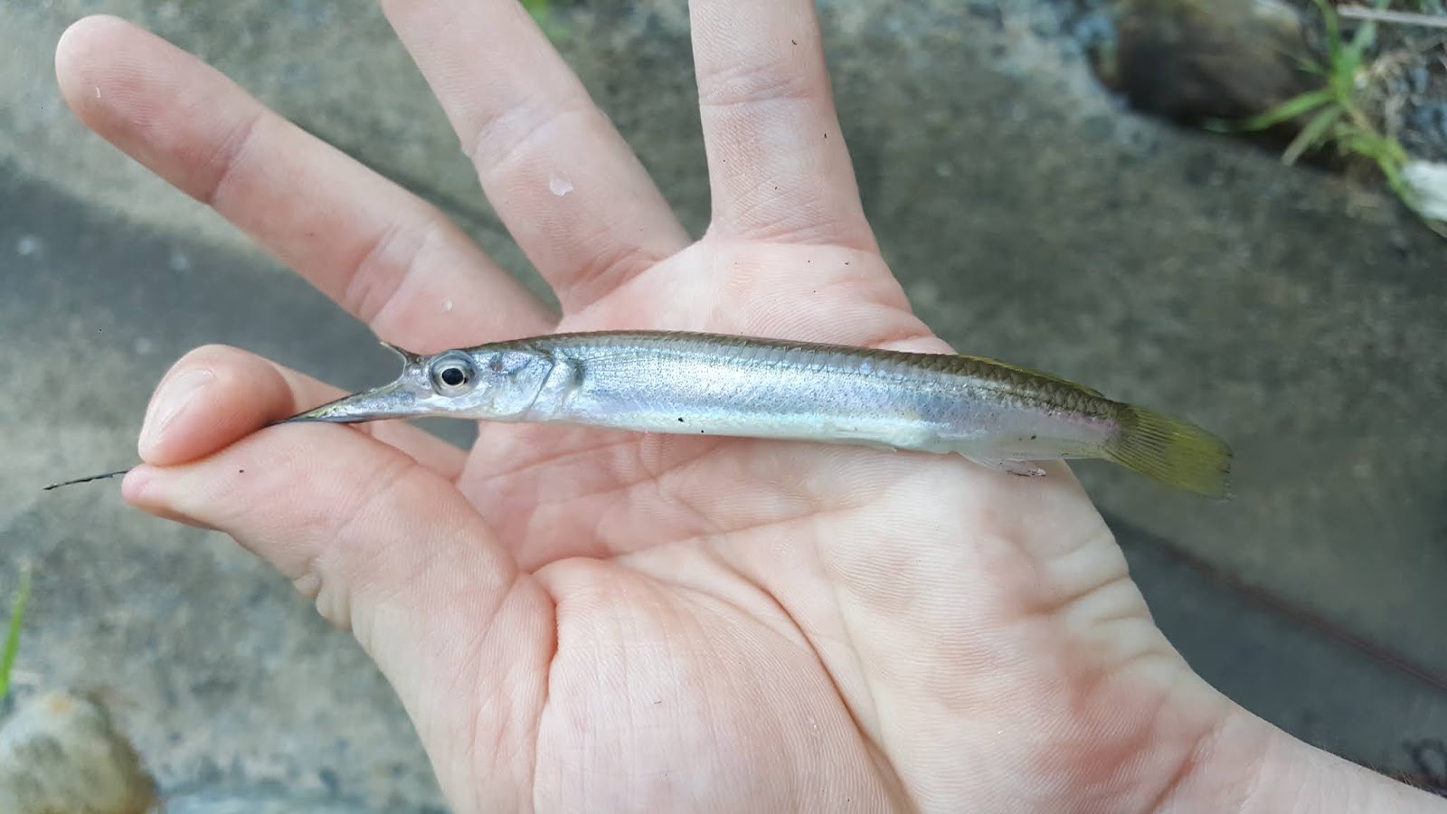 Next, it was time to start working on those Needlefish things. The only way I could get them interested was by skimming the bait back and forth right at the surface of the water. This also made it very difficult to hook up. I later learned this may also have had something to do with the shape of their mouths. Finally, I hooked up on one only to have it fall off the hook before I could bring it to land. The same thing happened with a second hookup. Finally, I let the third fish chew on the bait a while before setting, which proved successful! I pulled up and photographed lifer #2 of the trip: the Northern River Garfish. Check out that crazy snout!